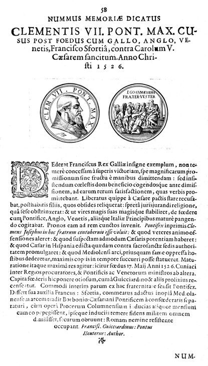 Description: A depiction of two coins. The left coin shows a profile of Pope Clement VII, and the right coin shows Joseph, son of Jacob, surrounded by his brothers.