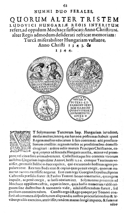Description: A depiction of four coins. The top left coin shows two noblemen facing each other, the top right coin shows a battle scene, the lower left coin shows the King Regnant of Hungary, and the lower right coin is blank.