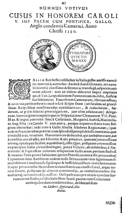 Description: A depiction of two coins. The coin on the left has a profile of Caesar Carolus V and the coin on the right has a wreath of olive leaves.