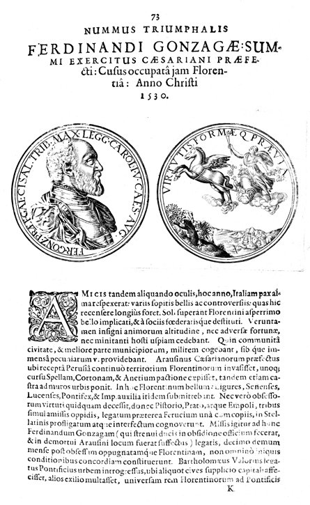 Description: A depiction of two coins. The coin on the left has a profile of Araufinus Cortonam and the coin on the right has a depiction Apollo on his winged chariot.