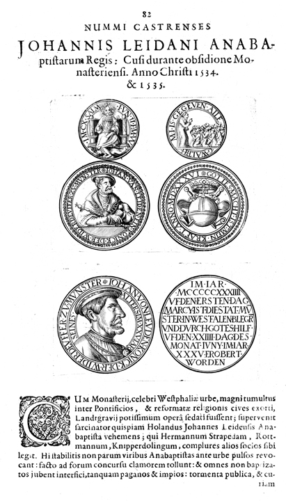 Description: A depiction of six coins. The top left coin shows a king on a throne. The top right coin shows a pastor preaching to a kneeling congregation. The center left coin shows a portrait of Johan von Lieden. The center right coin shows the papal orb with two swords and a crown. The lower left coin shows a profile of Johan von Leuden, and the lower right coin is blank.
