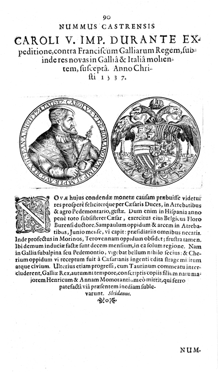 Description: A depiction of two coins. The left coin shows a profile of Emperor Carolus V and is dated 1537. The coin on the right shows a coat of arms with towers and fleur-de-lis topped by two eagles.