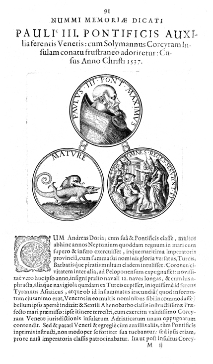 Description: A depiction of three coins arranged in a pyramid structure. The top coin shows a profile of Pope Paul III. The lower left coin shows a fish and a lizard, and the lower right coin shows a king anointing a soldier returning from battle.