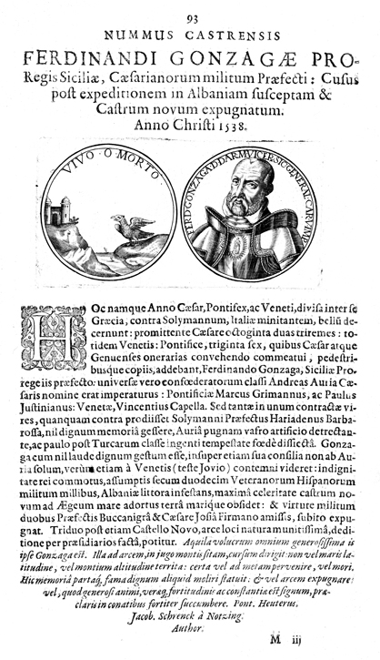Description: A depiction of two coins. The left coin shows a bird on a cliff across from a castle, with the inscription VIVO O MORTO, meaning “Life or Death.” The right coin shows a portrait of Fernando Gonzaga Imperial General of Sicily.