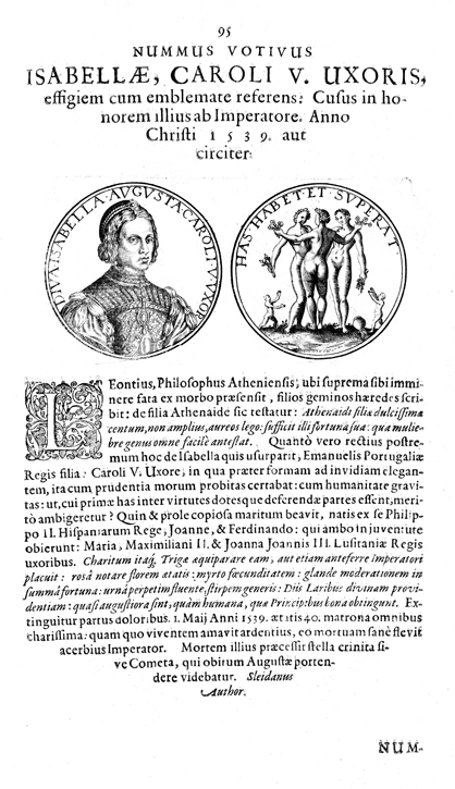 Description: A depiction of two coins. The coin on the left shows a portrait of Diva Isabella Augusta, wife of Carolus V. The coin on the right shows three naiads.
