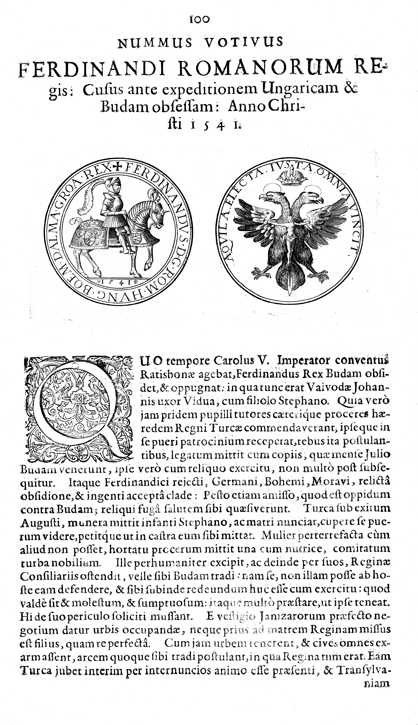 Description: A depiction of two coins. The coin on the left shows a depiction of King Ferdinand dressed as a knight on horseback. The coin on the right shows a two-headed eagle with Christ on the cross in the center.