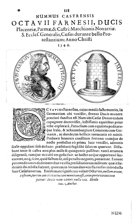 Description: A depiction of two coins. The coin on the left shows a profile of Octavius Farnesius and the coin on the right shows a tower.