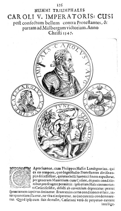 Description: A depiction of four coins. The top coin shows a profile of Emperor Carolus V Augustus. The center left coin shows a smaller profile of Emperor Carolus V Augustus and the center right coin shows an eagle standing on top of a globe. The bottom coin shows a depiction of Hercules defeating the hydra.