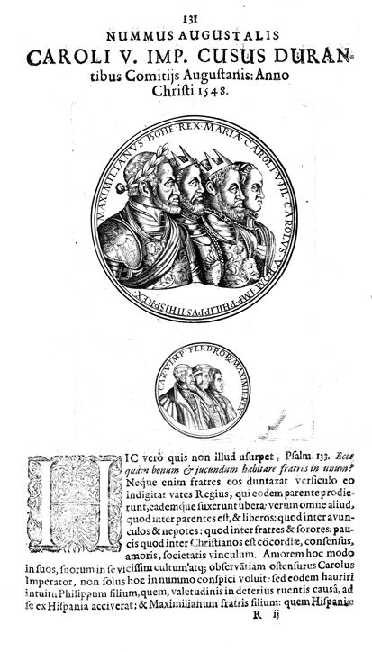 Description: A depiction of two coins. The top coin shows a depiction of King Maximillian, King Carolus VI, King Carolus V, and King Phillipus, and he bottom coin shows a depiction of King Carolus V, King Ferdinand, and King Maximillian.
