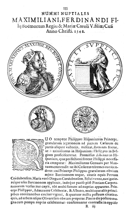 Description: A depiction of four coins. The top left coin shows a depiction of Diva Maria Divus and King Maximillian and the top right coin shows a depiction of a woman praying before an altar. The lower left coin shows a smaller depiction of Diva Maria Divus and King Maximillian, and the lower right coin shows a depiction of cherubim surrounding a lion rampant.