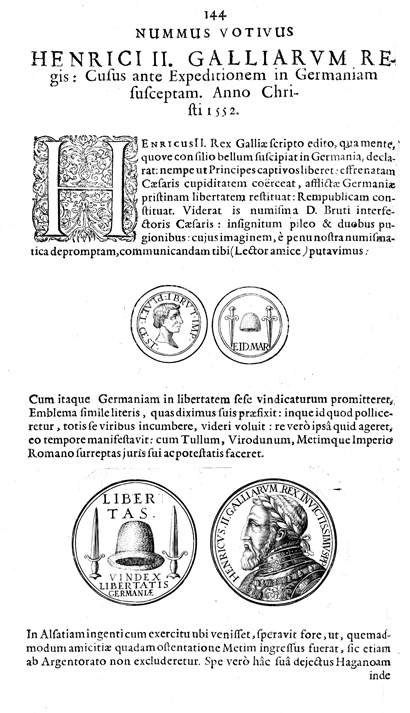 Description: A depiction of four coins. The top left coin shows a profile of Emperor Plavet and the top right coin shows a helmet flanked by two swords. The lower left coin shows a helmet flanked by two swords with the word LIBERTATE, meaning Liberty. The lower right coin shows a profile of Henricus II, King of Gaul.