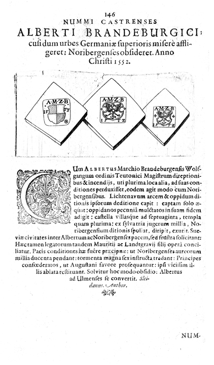 Description: A depiction of three coins. The left coin shows a coat of arms with the date 1553, the center coin shows an eagle displayed with the date 1552, and the right coin shows a smaller eagle displayed with the date 1552.
