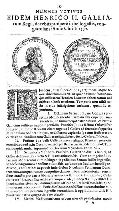 Description: A depiction of two coins. The coin on the left shows a profile of Henricus II, King of Gaul, and the coin on the right shows a laurel wreath.