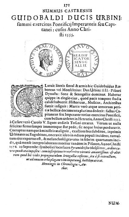 Description: A depiction of two coins. The left coin shows a profile of Cosmus of Florence, and the right coin shows a depiction of the Florence harbor with Neptune at its entry.