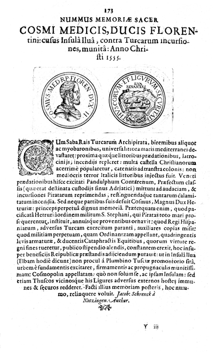 Description: A depiction of two coins. The left coin shows a profile of Cosmus of Florence, and the right coin shows a depiction of a suit of armor hanging from a tree branch in a river.