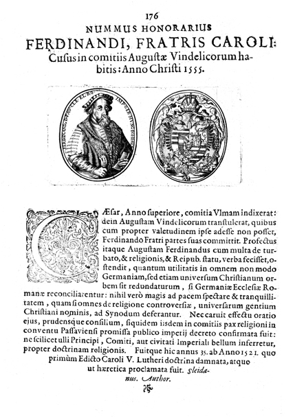 Description: A depiction of two coins. The left coin shows a depiction of Atlas holding the globe on his shoulders, and the right coin shows a profile of Phillip II, King of Spain.