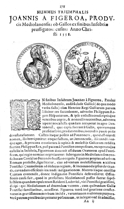 Description: A depiction of two coins. The left coin shows a profile of Joannes a Figueroa and the right coin shows a depiction of a triumphant knight being crowned by an angel.