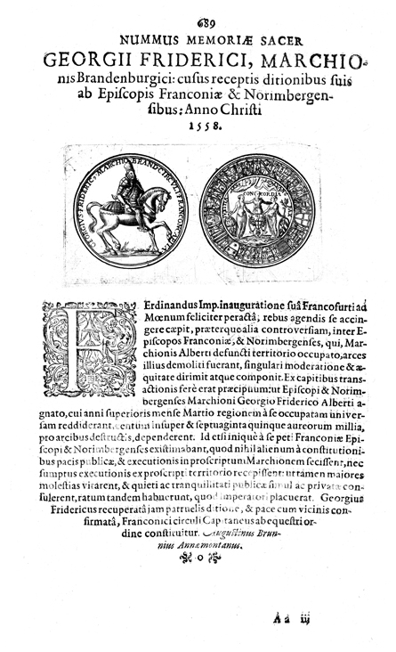 Description: A depiction of two coins. The left coin shows a depiction of a knight on horseback, and the right coin shows three women with shields at their feet within an ornamental border.