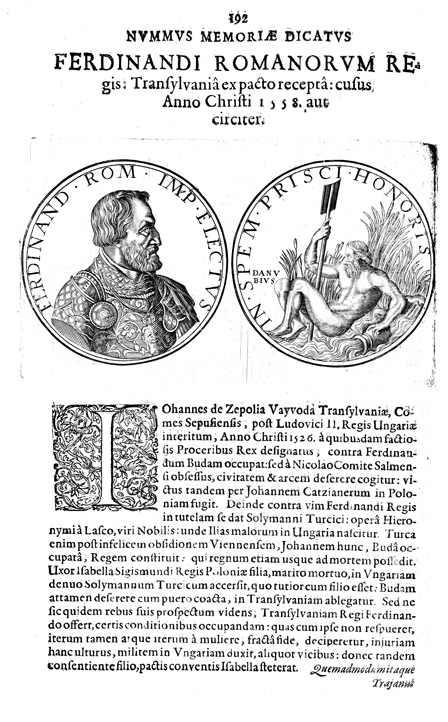 Description: A depiction of two coins. The left coin shows a profile of Emperor Ferdinand, and the right coin shows a depiction of a man resting in a stream.