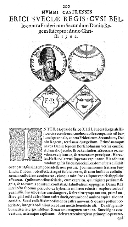 Description: A depiction of four coins. The top left coin shows a portrait of King Fricus. The top right coin shows a depiction of a sunrise over three islands. The lower left coin shows the letters ER beneath a crown. The lower right coin shows a coat of arms with three crowns, flanked by the date 1562.