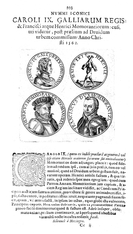 Description: A depiction of four coins. The top left coin shows a profile of Carolus IX. The top right coin shows a depiction of the mythical hero Hercules carrying two columns. The lower left coin shows a portrait of Henricus, and the lower right coin shows a portrait of Franciscus.