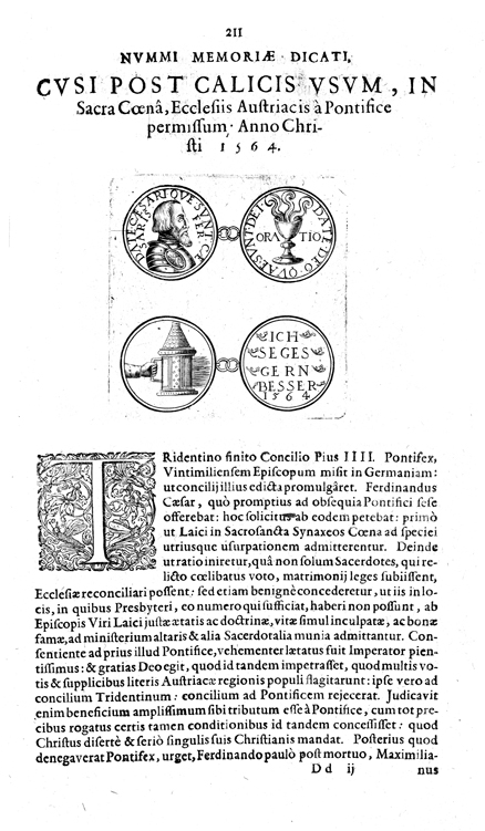 Description: A depiction of four coins. The upper left coin shows a profile of Ferdinandus Caesar. The upper right coin shows a depiction of a goblet. The lower left coin shows a depiction of a lantern letting forth light, and the lower right coin has an inscription of the year 1564.