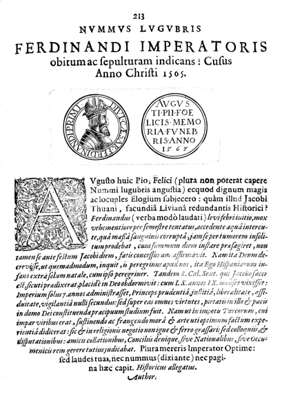 Description: A depiction of two coins. The left coin shows a profile of Caesar Ferdinandus the First and the right coin has an inscription of the year 1565.