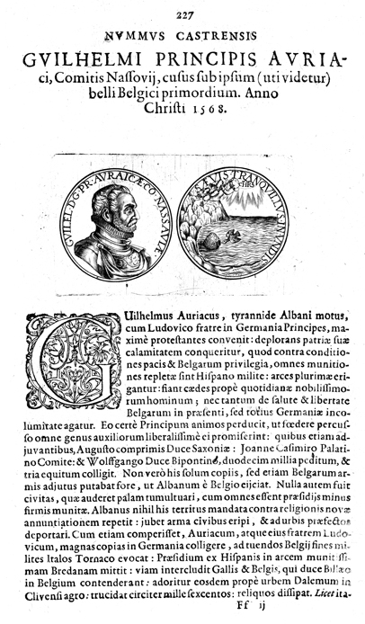 Description: A depiction of two coins. The left coin shows a portrait of Guilhelmus Auriacus and the right coin shows a depiction of a bird flying into a nest on a rock near the sea.