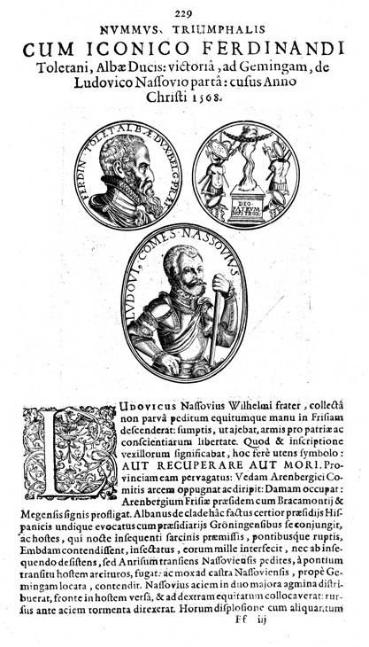 Description: A depiction of three coins. The top left coin shows a profile of Ferdinand Toletalbae. The top right coin shows a depiction of two coats of armor on either side of a fire on a pedestal. The lower coin shows a portrait of Ludovicus Naffocius Wilhelmi.