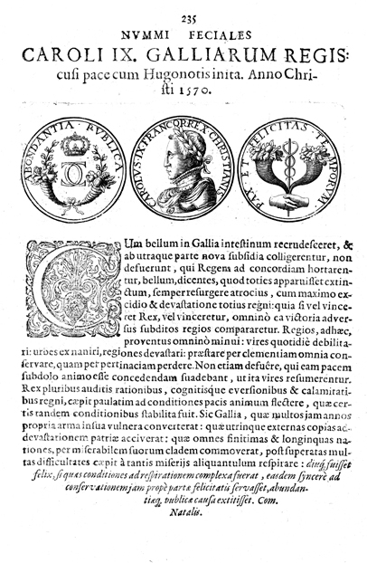 Description: A depiction of three coins. The left coin shows two intertwined C’s with two cornucopias below and a crown above. The center coin shows a profile of King Carolus IX. The right coin shows a caudecus with a cornucopia on either side and clasped hands below.