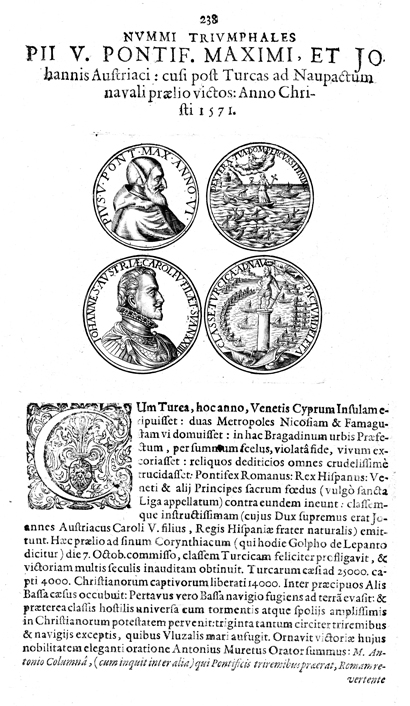 Description: A depiction of four coins. The top left coin shows a profile of Pope Pius VI. The top right coin shows a depiction of a goddess standing in the sea in the middle of a group of boats. The lower left coin shows a profile of John XXIIII. The lower right coin shows a depiction of a soldier standing on top of a column looking over a fleet of ships.