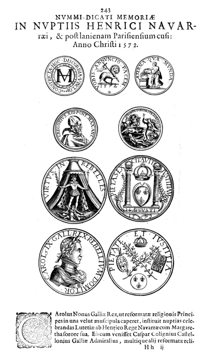 Description: A depiction of nine coins. In the top row of coins, the left coin shows the letter M within an ornamental border, the center coin shows a pascal lamb with the year 1572, and the right coin shows a woman placing an offering of a wreath on a fire. In the second row, the left coin shows a profile of Pope Gregorius XIII and the right coin shows a depiction of an angel carrying a cross and a sword killing the unrighteous. In the third row, the left coin shows a knight standing over a vanquished enemy in front of a tent and the right coin shows a shield with three fleur-de-lis topped by a crown and flanked by two columns with the year 1572 below. In the bottom row, the left coin shows a profile of King Carolus IX and the right coin shows a depiction of two crossed branches with a crown at the top, the Ten Commandments to the right, a shield with three fleur-de-lis at the bottom, and a sword on the left.