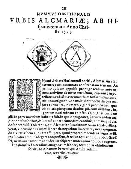 Description: A depiction of two coins. The left coin shows a depiction of a crenellated tower with the year 1573, and the right coin shows the letter A with the year 1573.