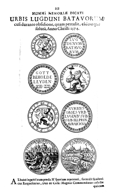 Description: A depiction of eight coins. In the top row of coins, the left coin shows a lion rampant with a sword and shield and the right coin shows a laurel wreath with the year 1574. In the second row of coins, the left coin shows a laurel wreath with the year 1574 and the right coin shows a lion rampant with a sword with crossed keys. In the third row, the left coin shows a lion rampant with a sword and shield with crossed keys and the right coin shows a laurel wreath with the year 1574. The bottom row shows a left coin with a depiction of soldiers fighting outside a field of tents, and a left coin with an aerial depiction of a battlefield.
