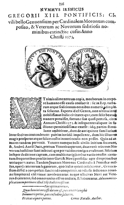 Description: A depiction of two coins. The left coin shows a profile of Pope Gregory XIII and the right coin shows a depiction of two women, one holding a sword and a set of scales and the other setting fire with a torch to a suit of armor.