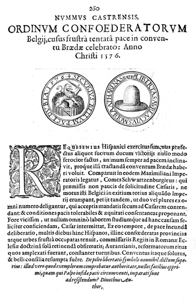 Description: A depiction of two coins. The left coin shows a depiction of lion rampant holding a sword and a bundle of arrows. The coin on the right shows a depiction of a hat.