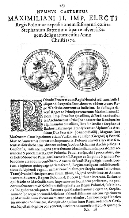 Description: A depiction of two coins. The left coin shows a soldier on horseback holding a spear, and the right coin shows a profile of Emperor Maximillian II.