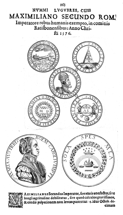 Description: A depiction of seven coins. The top left coin shows a depiction of a ship and a papal orb floating in the sea with an eagle flying above. The top right coin shows a pyramid topped by a crescent moon. The coin on the second row shows a profile of Emperor Maximillian II. The left coin on the third row shows a depiction of an olive wreath and the right coin shows a depiction of two goats. The bottom left coin shows a profile of Maria of Austria, and the bottom right coin shows a depiction of three crowns within a wreath.