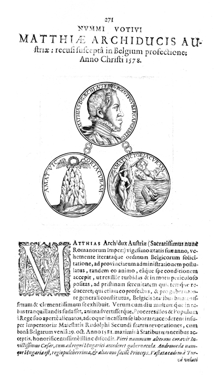 Description: A depiction of three coins. The top coin shows a profile of Mathias, Archduke of Austria. The lower left coin shows a depiction of a mountain topped by a winged wreath, and the lower right coin shows a depiction of a soldier rescuing a woman from a sea monster.