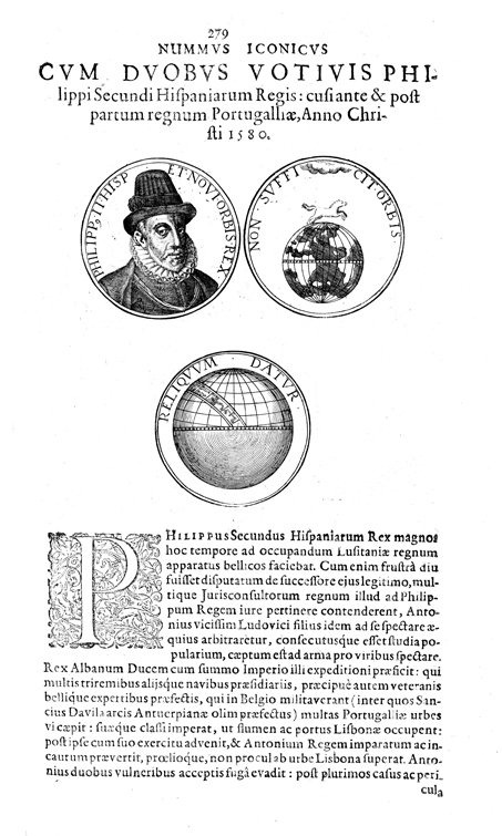 Description: A depiction of three coins. The top left coin shows a portrait of King Phillip II of Spain. The top right coin shows a depiction of a globe with a horse on top. The lower coin shows a depiction of a globe with latitude and longitude markings.