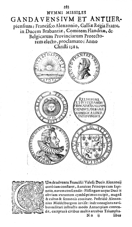 Description: A depiction of six coins. The top left coin shows a depiction of a sunrise over the ocean with an inscription of the year 1582. The top right coin shows a profile of Archduke Franz Ferdinand. The center left coin shows a depiction of the Tetragrammaton within two clasped hands and a sunburst. The center right coin has an inscription of the year 1582. The lower left coin shows a larger profile of Archduke Franz Ferdinand. The lower right coin shows a depiction of coat of arms with six fleur-de-lis and two lions rampant.