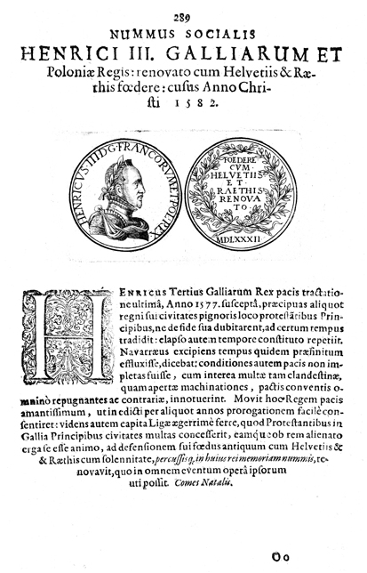 Description: A depiction of two coins. The left coin shows a profile of Henricus III and the right coin shows an olive wreath.
