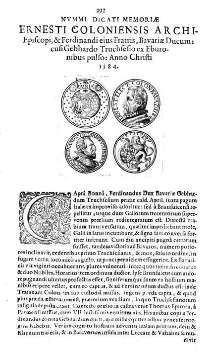 Description: A depiction of four coins. The top left coin shows a depiction of the all-seeing eye, the sun, and the moon within a field of stars. The top right coin shows a profile of Colonel Ernest of Bavaria. The lower left coin shows a profile of Ferdinand of Bavaria. The lower right coin shows a lion rampant holding a coat of arms.