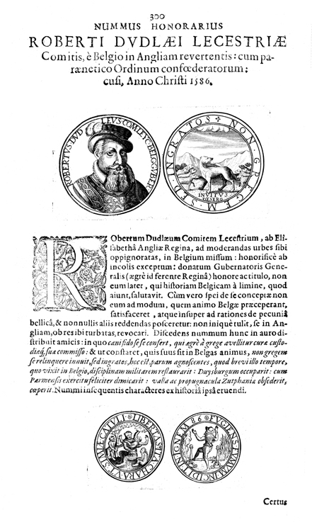 Description: A depiction of four coins. The top left coin shows a depiction of Robert Dudley. The top right coin shows a depiction of a dog surrounded by sheep. The lower left coin shows a depiction of monkeys in the forest, and the lower right coin shows a depiction of a man standing before a burning fire in a hearth.