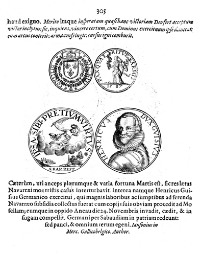 Description: A depiction of four coins. The top left coin shows a depiction of a coat of arms with three fleur-de-lis. The top right coin shows a depiction of a woman holding two branches with an inscription of the year 1587. The lower left coin shows a depiction of an angel holding a branch and flying over a city, and the lower right coin shows a portrait of Henricus X.