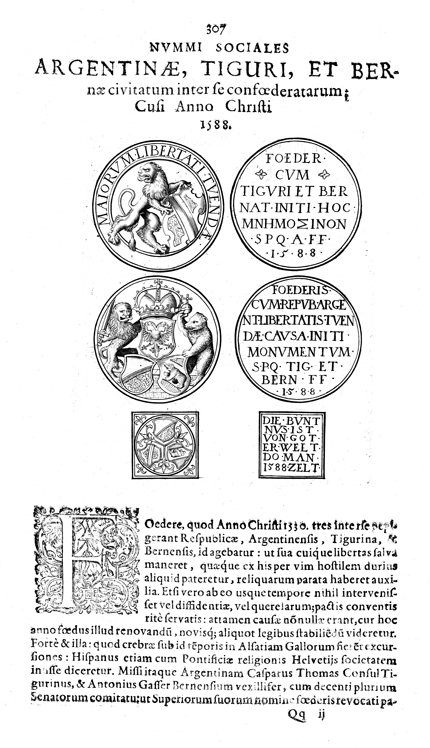 Description: A depiction of six coins. The top left coin shows a lion rampant with a shield. The top right coin has an inscription of the year 1588. The center left coin shows a coat of arms with a two-headed eagle with a lion rampant on one side and a bear on the other. The center right coin has an inscription of the year 1588. The lower left coin shows three coats of arms. The lower right coin shows an inscription of the year 1588..
