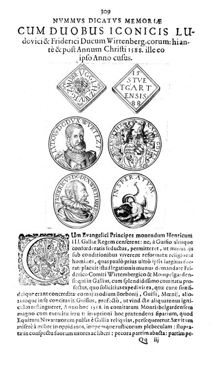 Description: A depiction of six coins. The top left coin shows a coat of arms with waves and fish. The top right coin shows an inscription of the year 1588. The center left coin shows a portrait of Ludous Wurtezt. The center right coin shows a coat of arms topped by two helmets and a dog. The lower left con shows a profile of Fridericus of Wirtemberg. The lower right coin shows a depiction of a dragon that has been killed by an arrow.