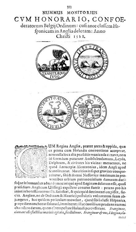 Description: A depiction of four coins. The top left coin shows a depiction of two bulls pulling a plough. The top right coin show shows a depiction of two urns floating in the sea. The lower left coin shows two clasped hands beneath a winged caudecus, and the lower right coin shows two coats of arms topped by crowns and linked with scrollwork.