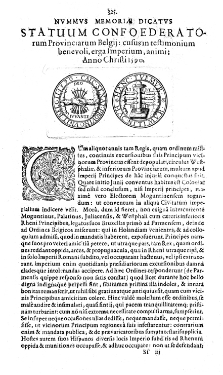 Description: A depiction of two coins. The left coin shows a depiction of two clasped hands holding a cluster of arrows. The right coin shows a depiction of six hands grasping a column topped by a hat.
