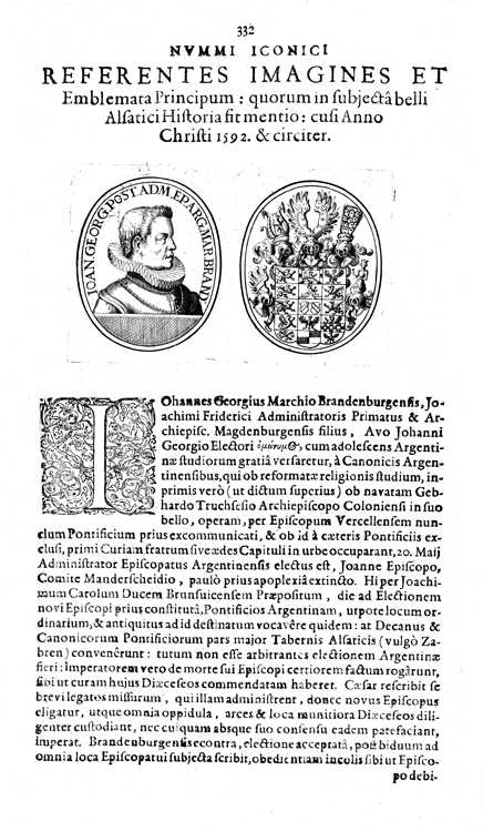 Description: A depiction of two coins. The left coin shows a profile of Johannes Georgius Marchio Brandenburgen, and the right coin shows a depiction of an elaborate coat of arms with six griffins and three eagles displayed, topped by five helmets.